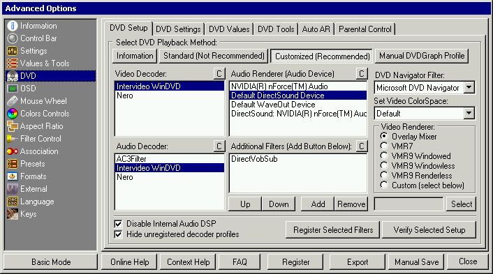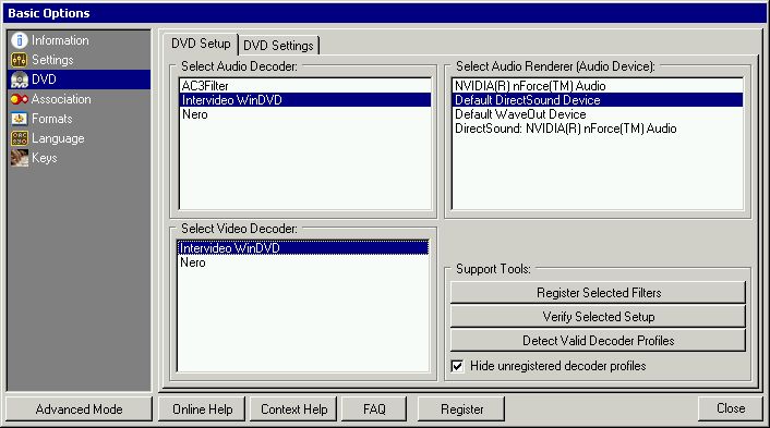 You are now in the Basic Options Screen, click on DVD, there you should see a list of video and audio decoders. NOTE: You may have different decoders, but nothing to worry. Choose WinDVD or PowerDVD decorders if installed.